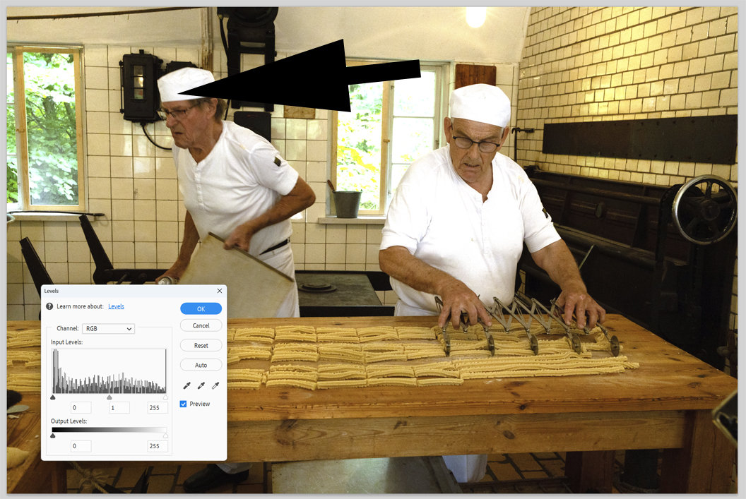 Der er valgt Enhance - Adjust Lightning - Levels. Vælg