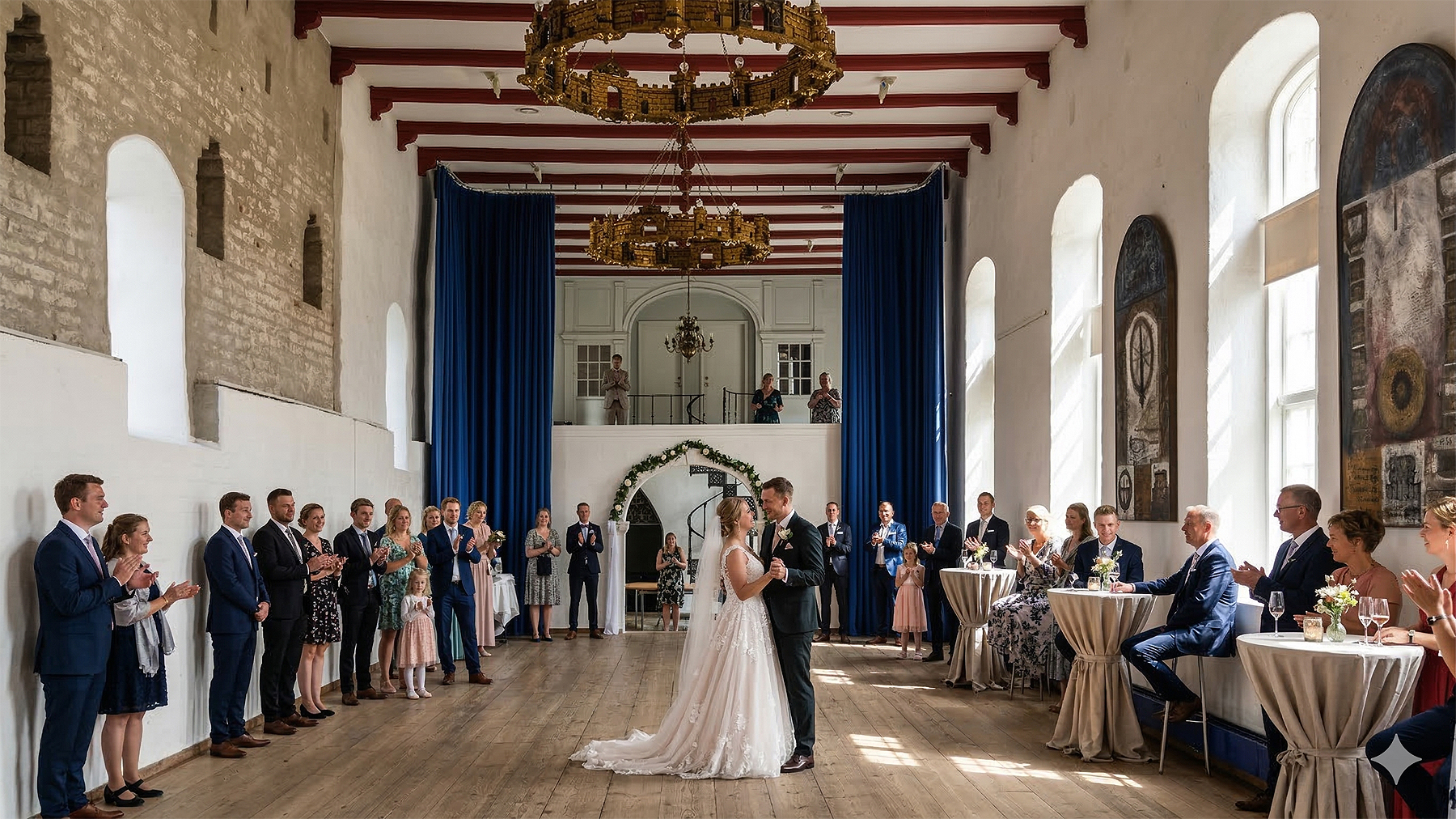 Lav foto af brudepar og gæster i salen