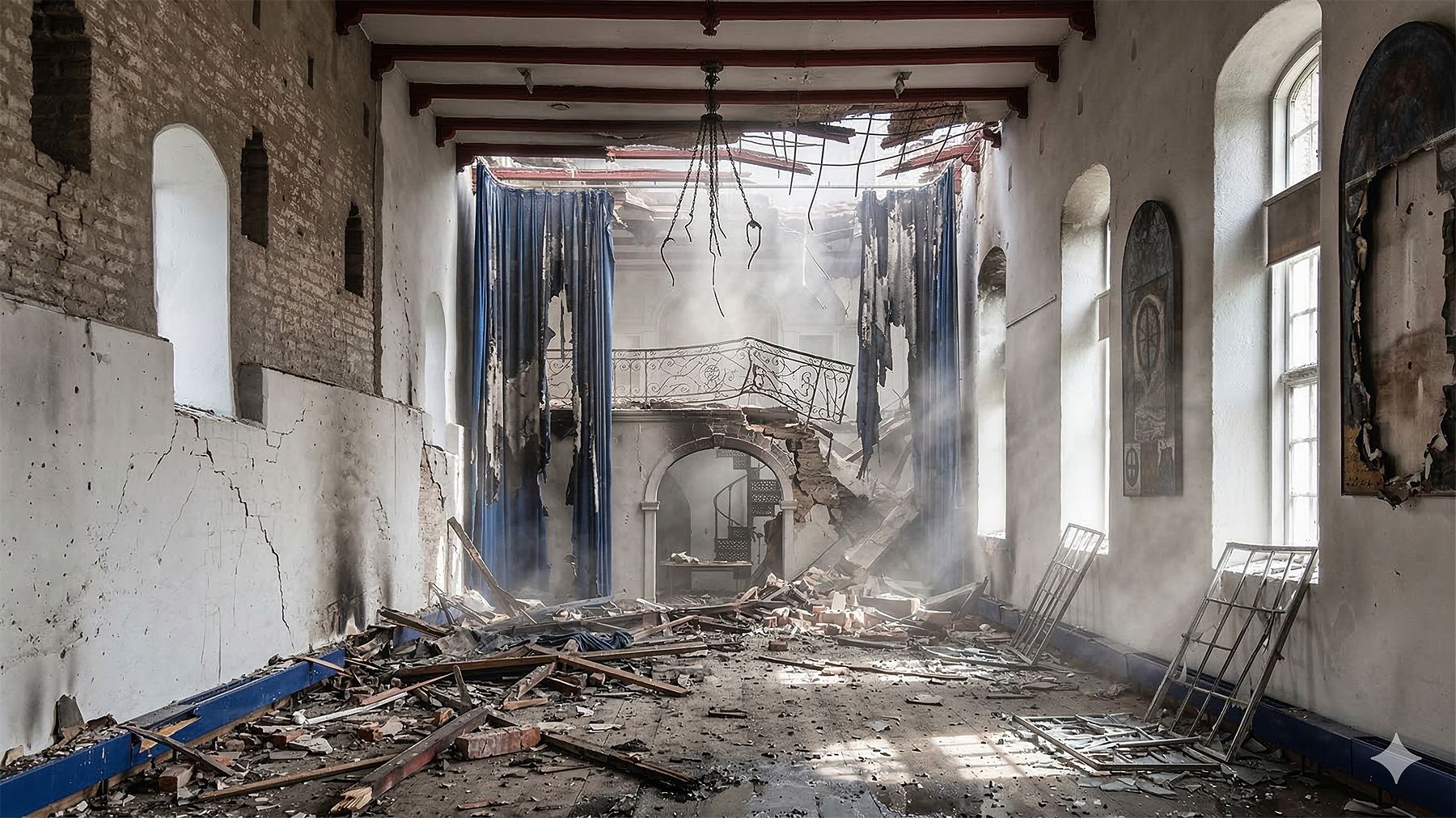 Lav foto, der viser at salen er hærget af en eksplosion