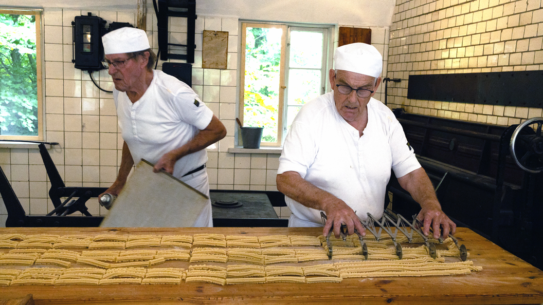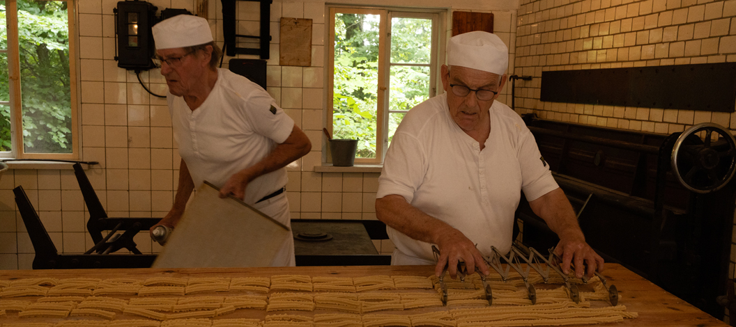 Billedet af de to bagersvende er taget inde i bageriet på Hjerl Hede.