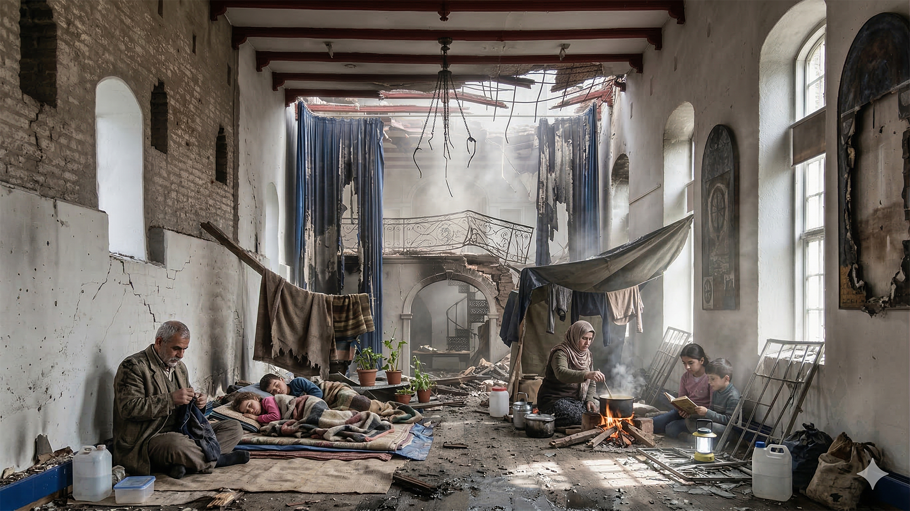 En flygtningefamilie har slået lejr i den ødelagte sal